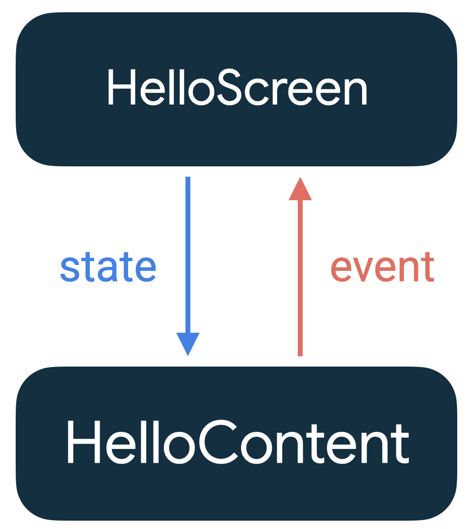 위 그림처럼 State가 아래로 내려가고 Event가 올라가는 패턴을 단방향 데이터 플로우라고 한다. 이 경우 state가 HelloScreen에서 HelloContent로 내려가고, event가 HelloContent에서 HelloScreen으로 올라간다. 단방향 데이터 플로우에 따르면 UI에 상태를 화면에 표시하는 Composable과 상태를 저장하고 변경하는 앱 부분을 서로 분리할 수 있다.