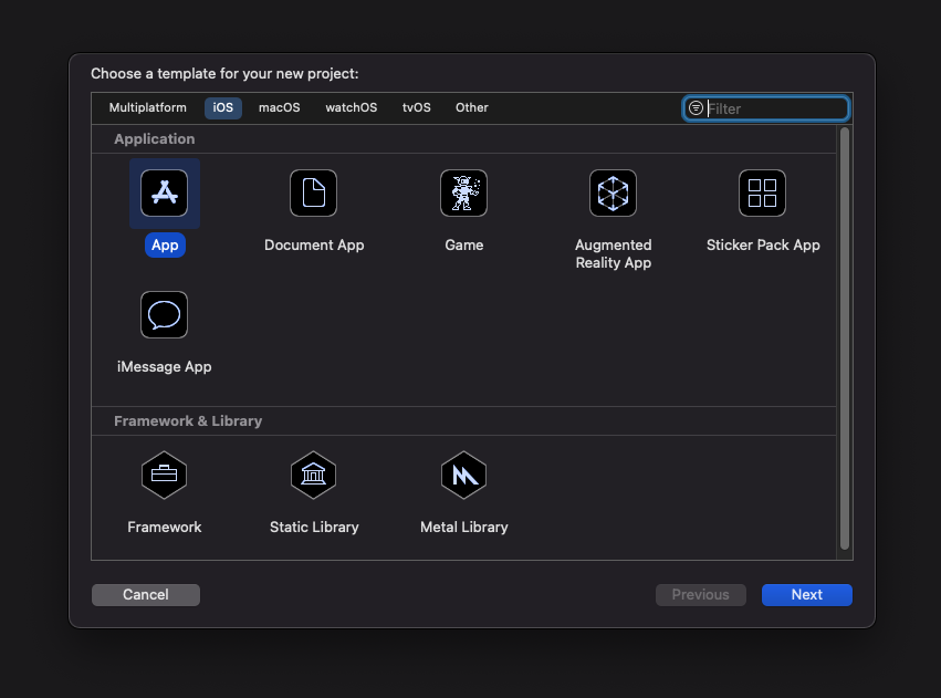 SwiftUI 프로젝트 생성 - 1 2. iOS의 App을 선택한 후 Next를 클릭한다.