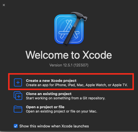 1. xcode를 실행하여 Create a new Xcode project를 클릭한다.